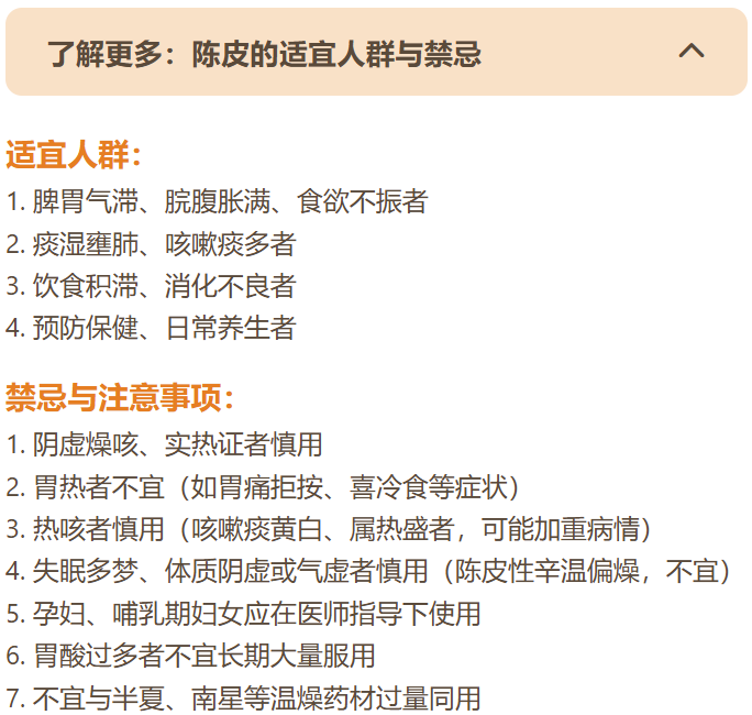 陈皮是陈年的黄金,经久价值及药效最高,一般的陈皮也要放置三年以上才能称之为“陈皮”;三年的皮味最香浓,会有人以为是桔子之皮,实则不是,并不是所有的桔子都能做成陈皮。早在《神农本草经》就有记载,名橘柚,又称“橘皮”。陶弘景在《本草经集注》中讲:“橘皮,须陈久者良”,故名陈皮。陈久的橘皮燥烈性小,理气调中,又可避免燥烈伤阴。陈皮的应用关键在于“辨证”。其效在于"温、燥、行",因此最适合"寒、湿、滞"相关的病症。对于存在"热、燥、阴虚"倾向的情况,则应避免或谨慎使用。